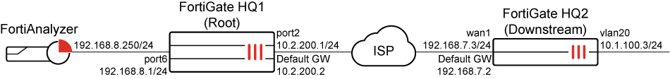 The root FortiGate (HQ1) is connected by the downstream FortiGate (HQ2) with VPN icon in the middle.