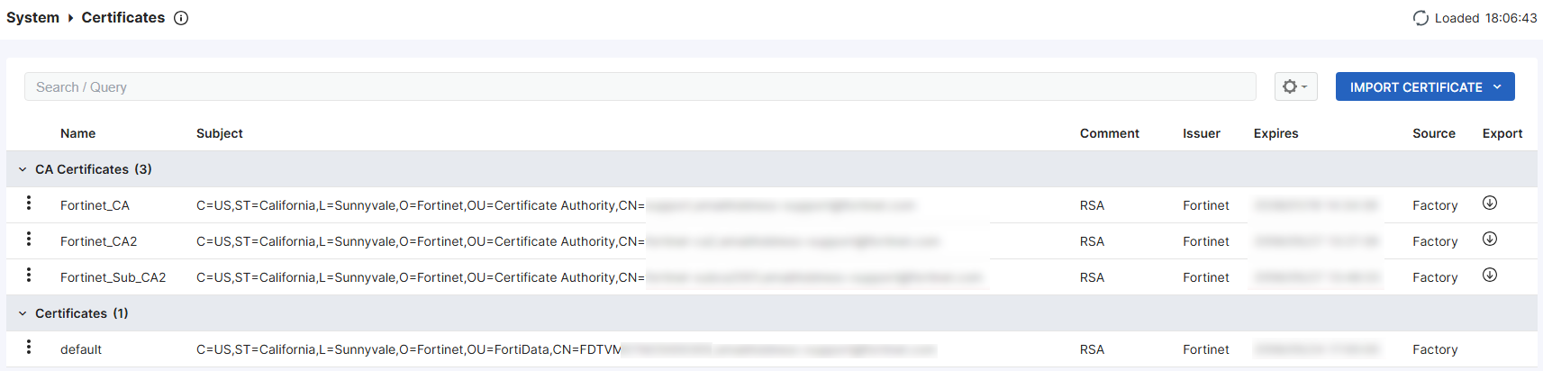 On the System > Certificates page, verify that at least one TLS certificate is listed. FortiData includes a default certificate that you can use.