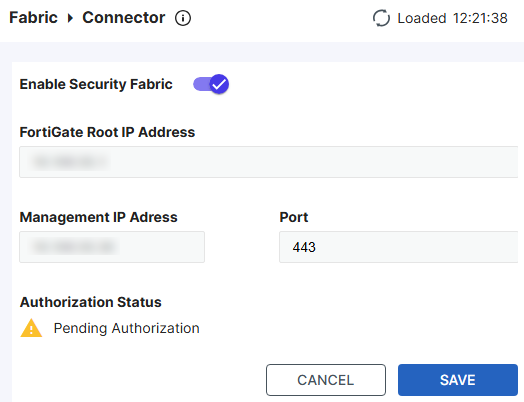 In FortiData on the Fabric > Connector page, enable security fabric, specify the details of the FortiGate, and click SAVE.