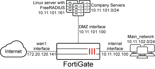 Example.com has an office with 20 users on the internal network who need access to the Internet. The office network is protected by a FortiGate-60C with access to the Internet through the wan1 interface, the user network on the internal interface, and all servers are on the DMZ interface. This includes an Ubuntu sever running FreeRADIUS. This example configures two users: