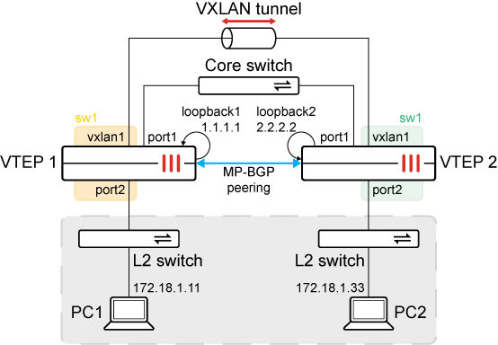 In this example, two FortiGates are configured as VXLAN tunnel endpoints (VTEPs). A VXLAN is configured to allow L2 connectivity between the networks behind each FortiGate. The VXLAN interface vxlan1 and port2 are placed on the same L2 network using a software switch (sw1). An L2 network is formed between PC1 and PC2. MP-BGP EVPN is used as the control plane to learn and distribute MAC address information within a single L2 domain identified using a specific VNI.