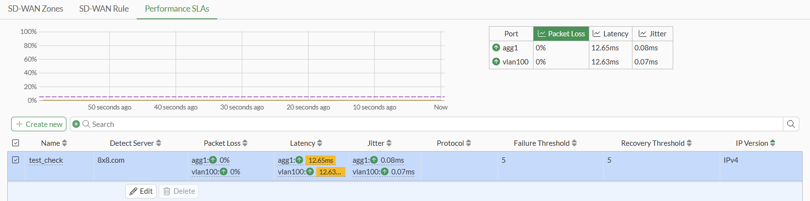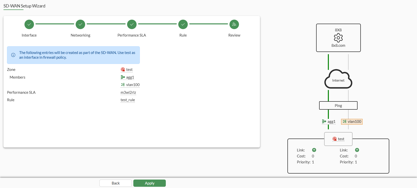 This example describes how to use the SD-WAN Setup wizard to create an SD-WAN configuration with one SD-WAN zone (named Test) and two SD-WAN members (agg1 and vlan100). The wizard also guides you to complete the networking, performance SLA, and SD-WAN rule. After the wizard completes, configure a default static route for the SD-WAN interface.