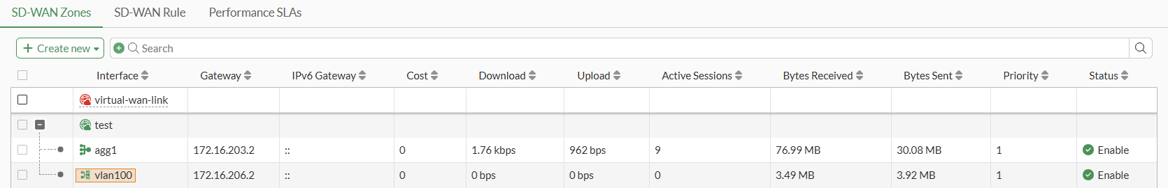 The selected interfaces become members of the SD-WAN zone. This example creates a zone named Test and uses two interfaces (agg1 and vlan100).