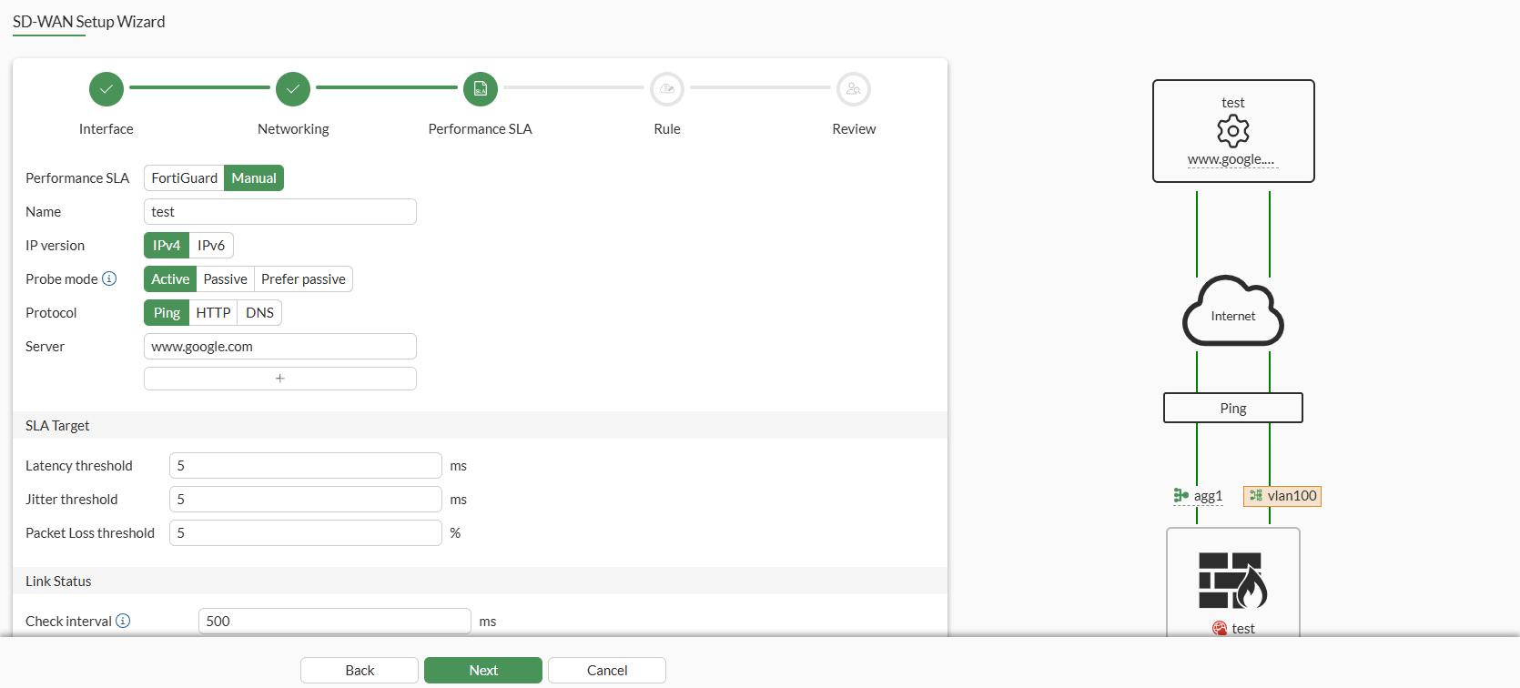 For the Performance SLA step, configure health-check for SD-WAN members, and click Next: