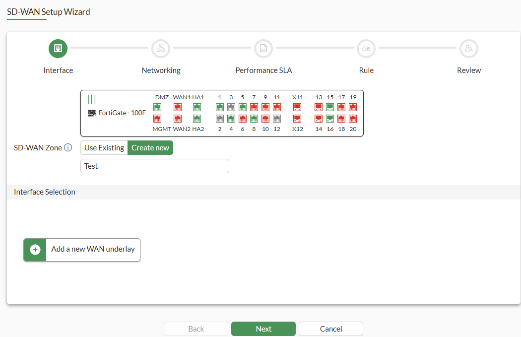 For the Interface step, identify a zone, and select one or two interfaces for the underlay: