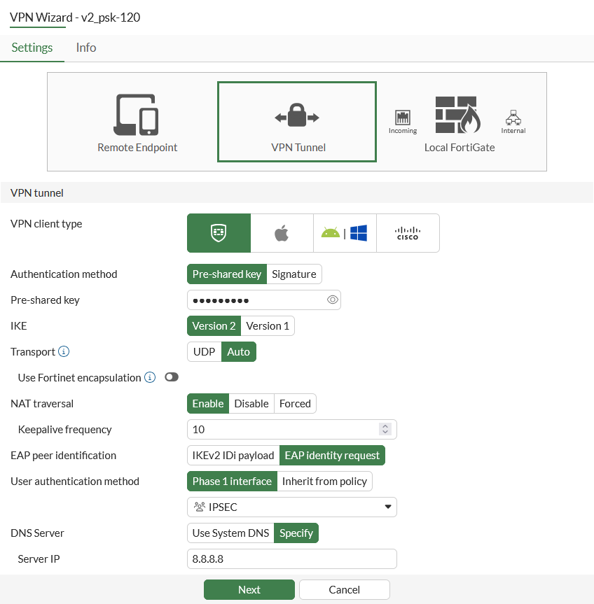 config vpn ipsec phase1-interface edit "v2_psk-120" set type dynamic set interface "port1" set ike-version 2 set peertype any set net-device disable set mode-cfg enable set ipv4-dns-server1 8.8.8.8 set proposal aes128-sha256 aes256-sha256 aes128gcm-prfsha256 aes256gcm-prfsha384 chacha20poly1305-prfsha256 set dhgrp 20 21 set eap enable set eap-identity send-request set authusrgrp "IPSEC" set transport tcp set fortinet-esp disable set ipv4-start-ip 9.5.6.7 set ipv4-end-ip 9.5.6.70 set ipv4-split-include "v2_psk-120_split" set save-password enable set client-auto-negotiate enable set client-keep-alive enable set psksecret ******* next end