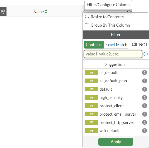Depending on the table content, you can apply filters using the filter bar, a column filter, or based on a cell's content. Some tables allow filtering based on regular expressions.