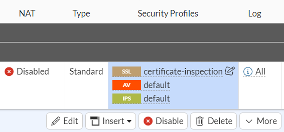 In some tables, parts of a configuration can be edited directly in the table. For example, you can add security profiles to an existing firewall policy. For the firewall policy, click the Security Profiles cell to display, and then click the edit icon.