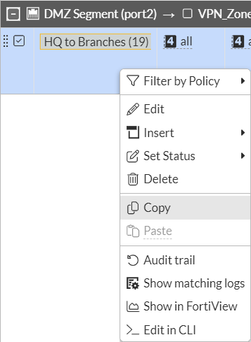 In some tables, rows can be copied and pasted using the right-click menu. For example, a policy can be duplicated.