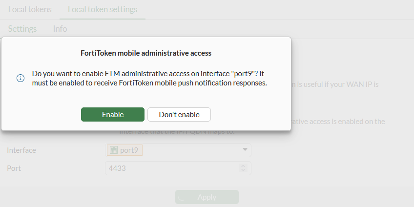7. If FortiToken mobile administrative access is not enabled on the selected interface, a pop-up message will ask to enable it. Click Enable.