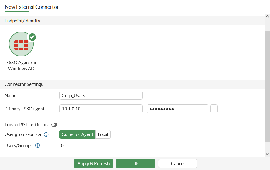 In this example, a collector agent (CA) is installed on a Windows machine to poll a domain controller (DC) agent (seeFSSO for more information). On the FortiGate, an external connector to the CA is configured to receives user groups from the DC agent. The received group or groups are used in a policy, and some examples of the usernames in logs, monitors, and reports are shown.