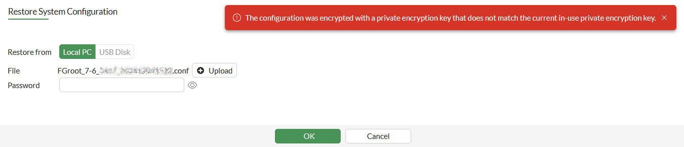 You cannot restore a private key-encrypted configuration via the FortiOS GUI if private-data-encryption is disabled. The following shows the GUI in this scenario: