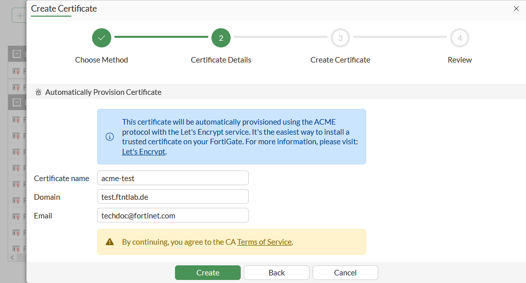 The Automated Certificate Management Environment (ACME), as defined in RFC 8555, is used by the public Let's Encrypt certificate authority (https://letsencrypt.org) to provide free SSL server certificates. The FortiGate can be configured to use certificates that are managed by Let's Encrypt, and other certificate management services, that use the ACME protocol. The server certificates can be used for secure administrator log in to the FortiGate.