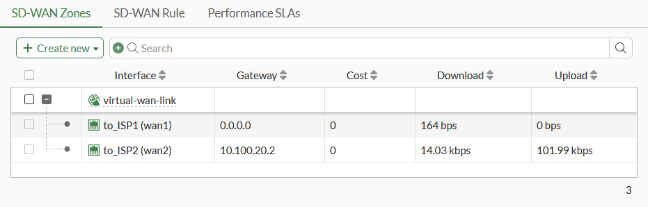 Once the SD-WAN members are created and added to a zone, the zone can be used in firewall policies, and the whole SD-WAN can be used in static routes.