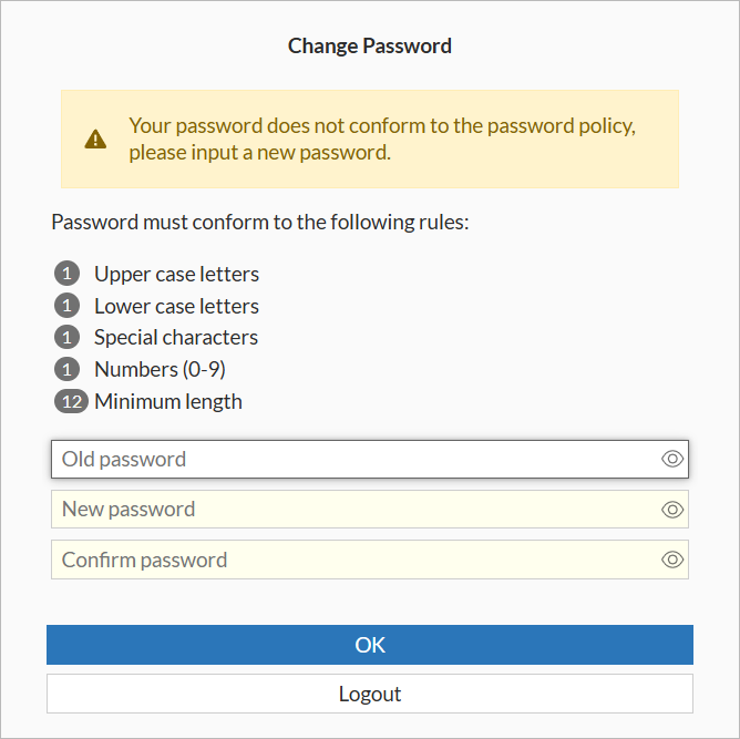 Change the password and click OK. The login page is displayed again.