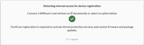 While the Detecting internet access for device registration dialog box is displayed, use an Ethernet cable to connect the WAN port on the FortiGate to an upstream router, switch, or modem with access to the internet.