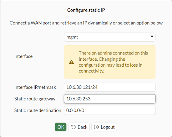 config system interface edit <interface> set mode static set ip <address> <netmask> next end config router static edit 0 set gateway <gateway IP> set device <interface> next end