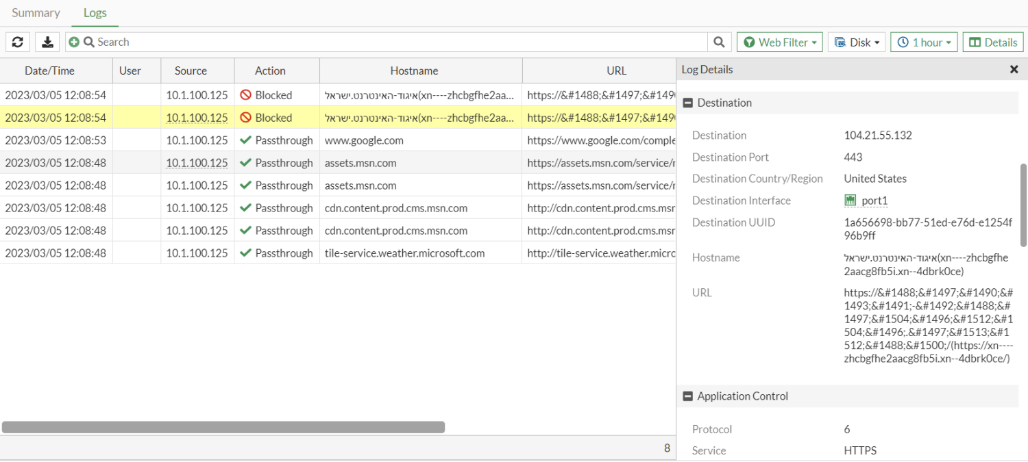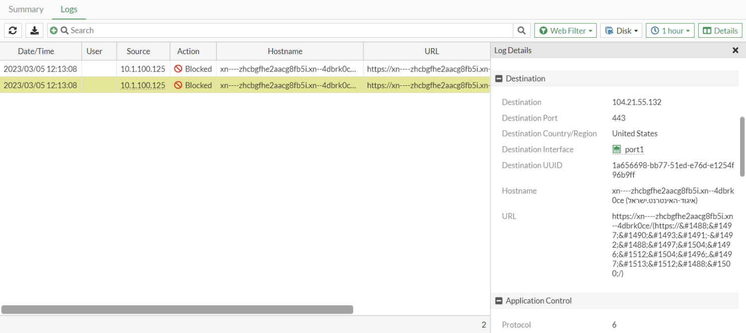 In the following example, a Hebrew URL (איגוד-האינטרנט.ישראל) is blocked in by a static URL filter. The URL translates to: