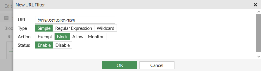 Enter the Hebrew URL and set the Action to Block. The URL can be entered in Hebrew.