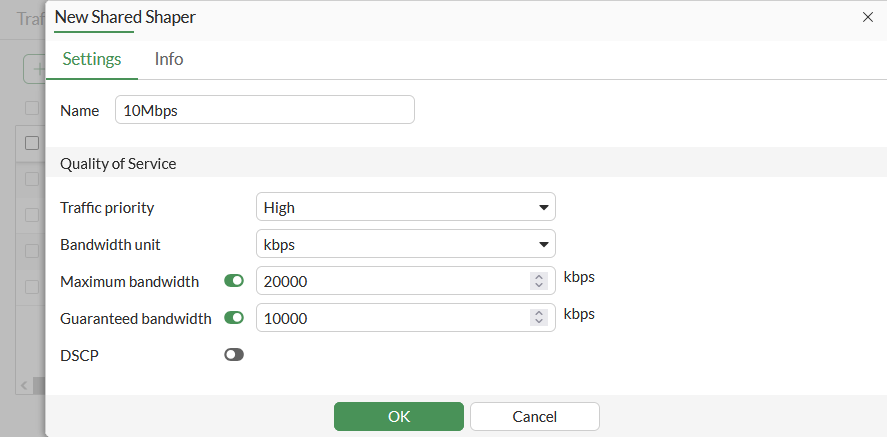 Repeat the above steps to create another traffic shaper named 1Mbps with the Traffic Priority set to Low, the Max Bandwidth set to 10000, and the Guaranteed Bandwidth set to 1000.