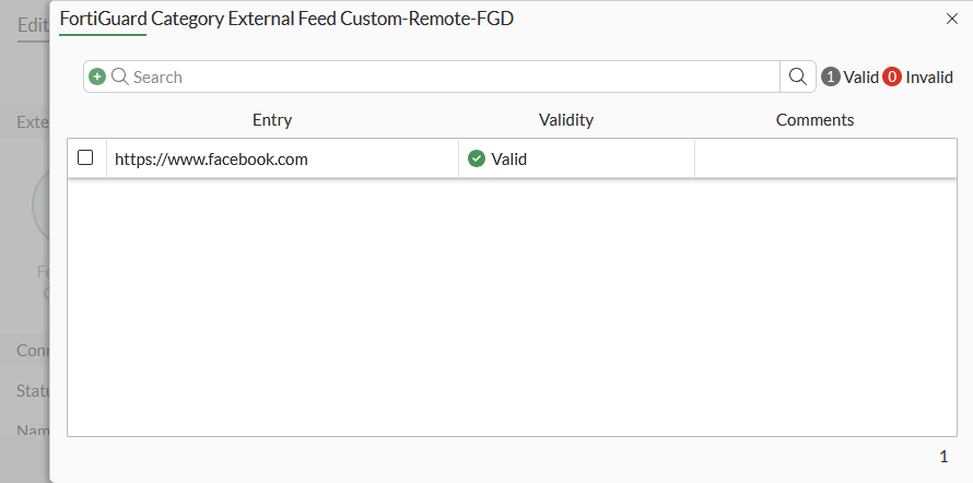 In this example, a list of URLs is imported using the FortiGuard category external feed. The newly created external feed is set to block in the web filter profile, and the web filter profile is applied to a firewall policy. Any traffic that passes through the FortiGate and matches the URLs in the external feed list will be dropped.