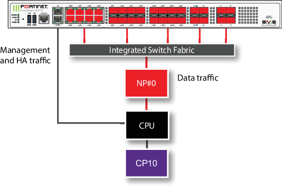 The MGMT interface is not connected to the NP7 processor. Management traffic passes to the CPU over a dedicated management path that is separate from the data path. You can also dedicate separate CPU resources for management traffic to further isolate management processing from data processing (see Improving GUI and CLI responsiveness (dedicated management CPU)).