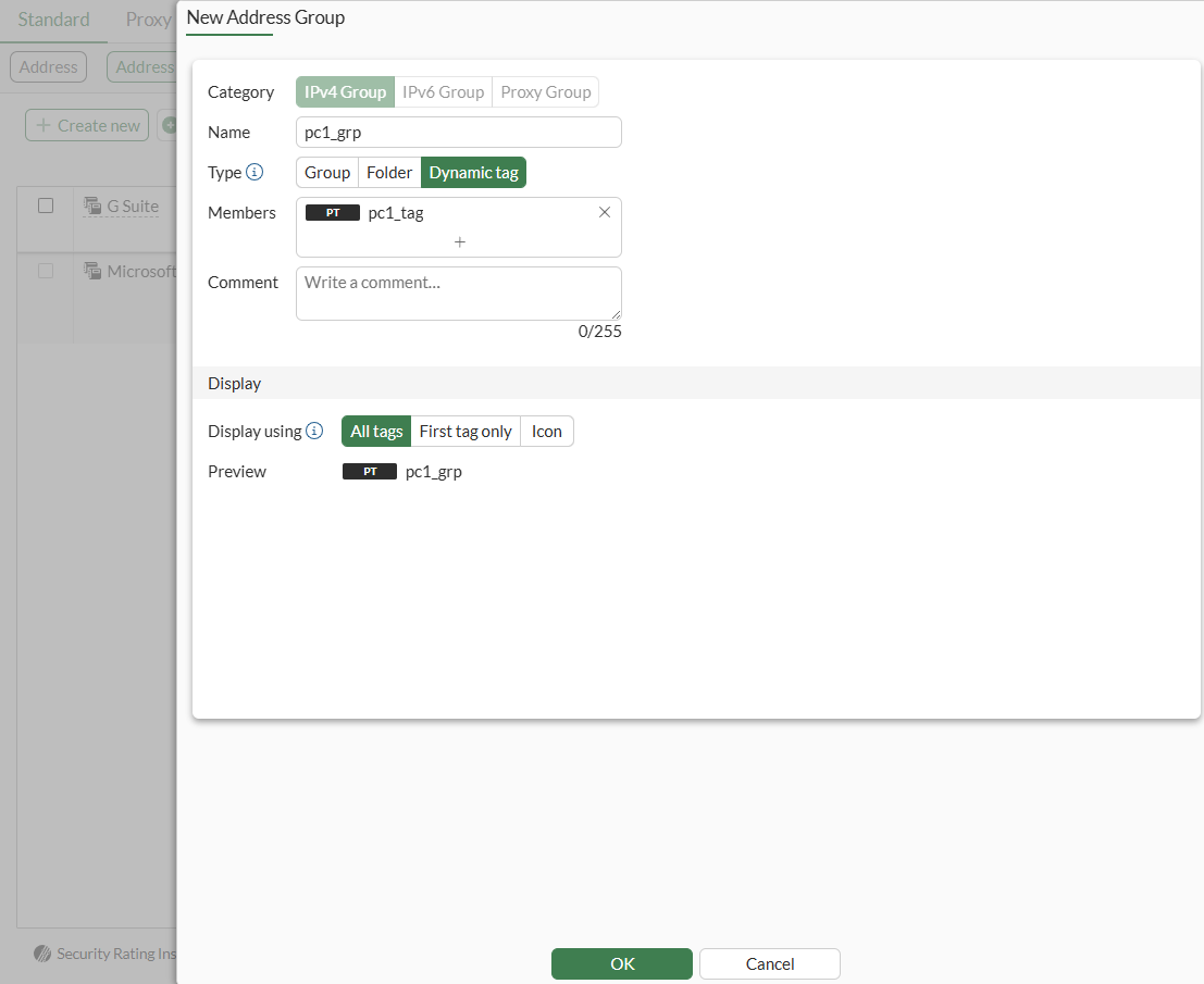 For example, you could create more address objects assigned the pc1_tag for the firewall policy to automatically use the address objects for the pc1_grp, which is configured to use address objects assigned the pc1_tag.