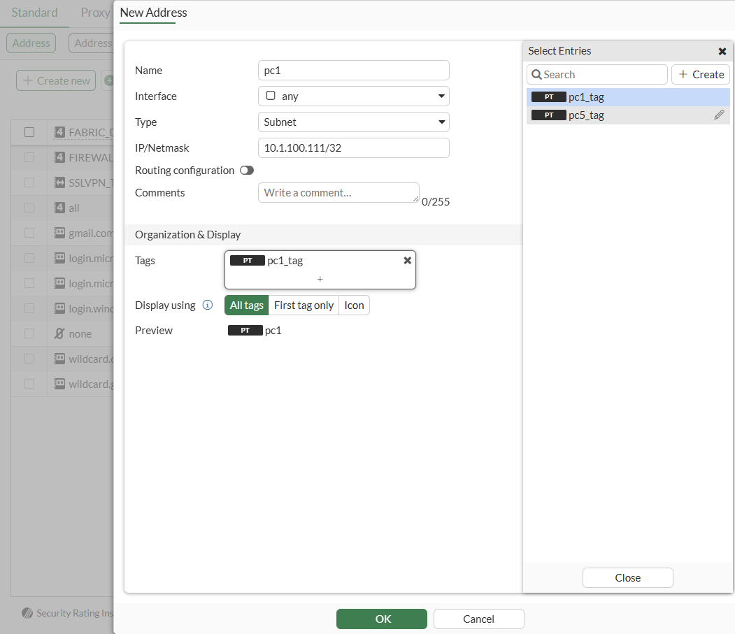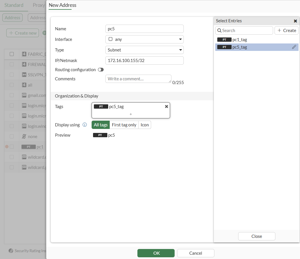 Create two address objects for PC1 and PC5 and assign to them the tags you created: