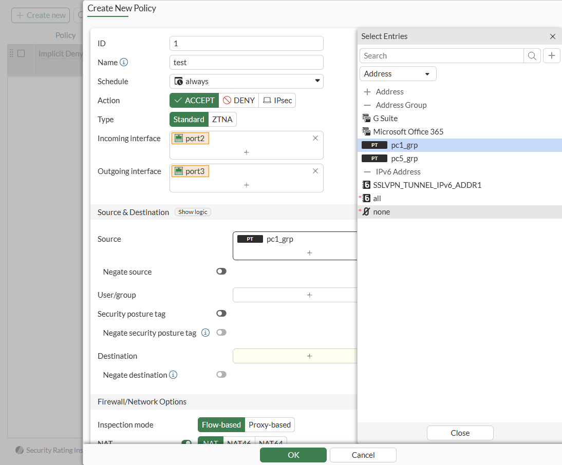 config firewall policy edit 1 set srcintf "port2" set dstintf "port3" set action accept set srcaddr "pc1_grp" set dstaddr "pc5_grp" set schedule "always" set service "ALL" set auto-asic-offload disable next end