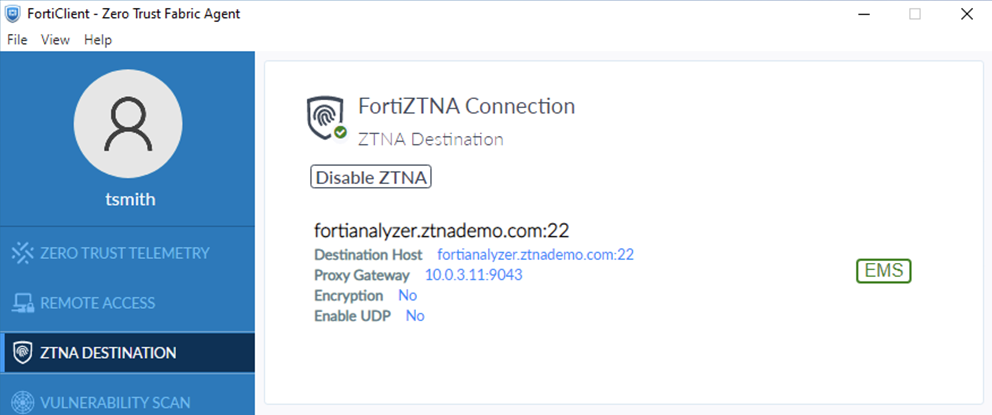 After some time, the FortiClient will receive the profile update and the configuration will appear under the ZTNA DESTINATION tab on FortiClient.