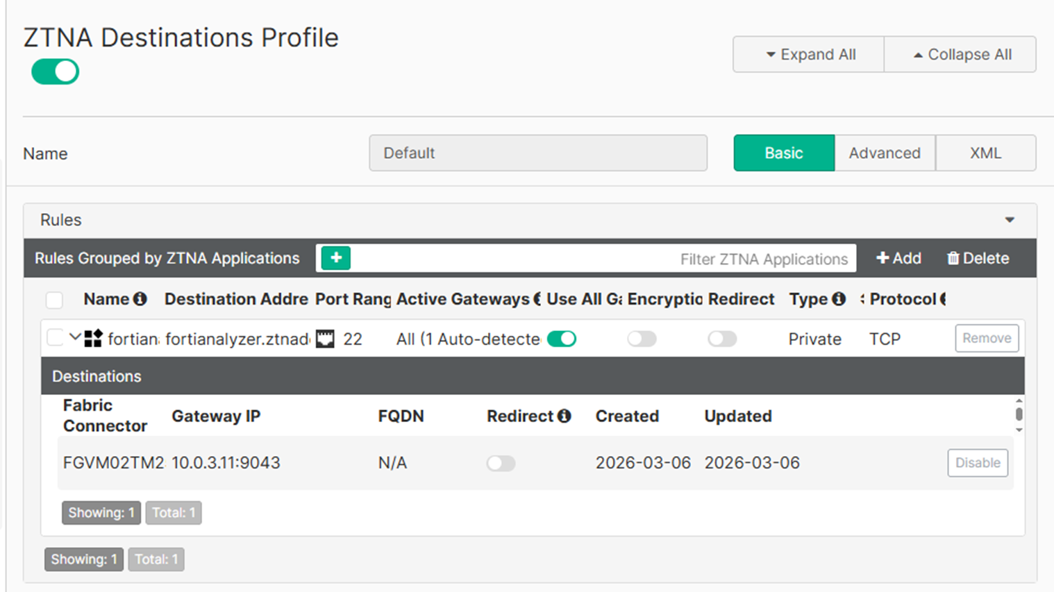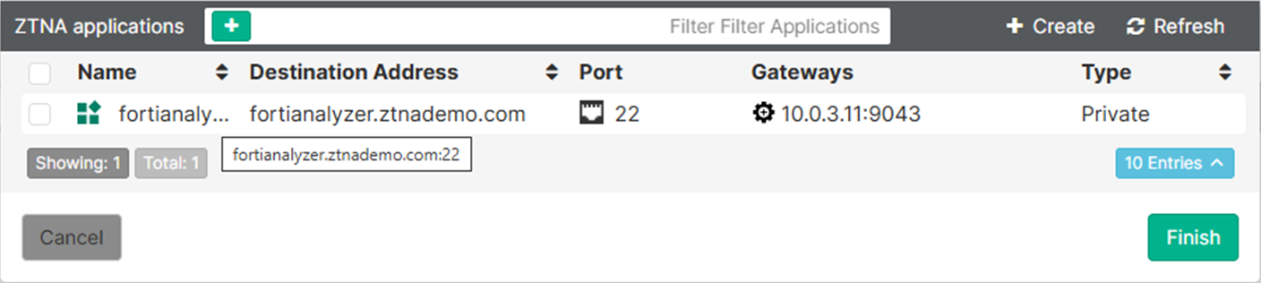 The ZTNA applications will display the fortianalyzer.ztnademo.com:22 destination created earlier on the FortiGate. You can hover over the name field to show the full name.