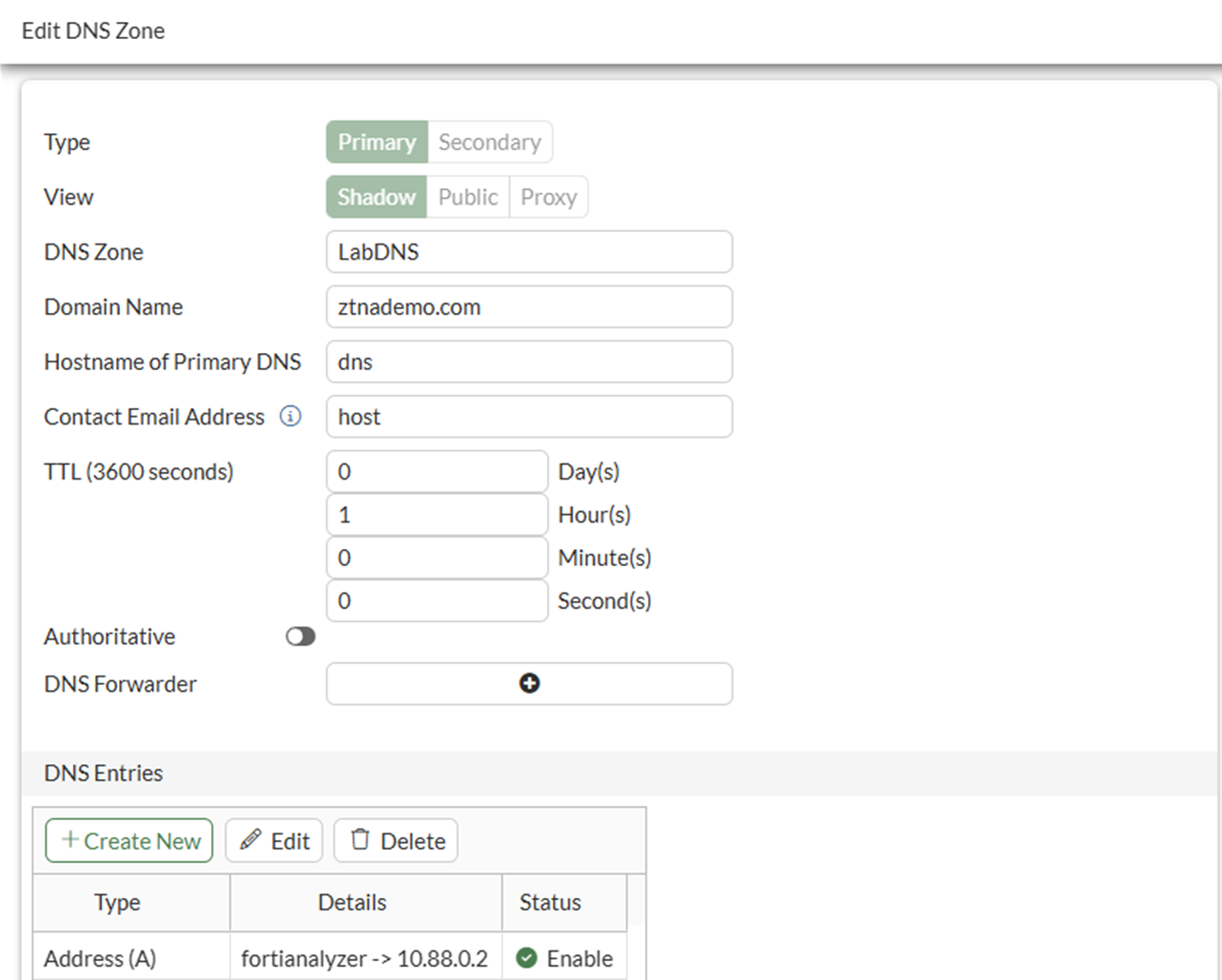 The FQDN fortianalyzer.ztnademo.com does not currently resolve to anything. A DNS entry is required for the FortiGate to resolve the FQDN to the FortiAnalyzer IP address of 10.88.0.2. In this example, the FortiGate itself is functioning as the DNS server and a DNS entry must be added to map the FQDN to an IP address.