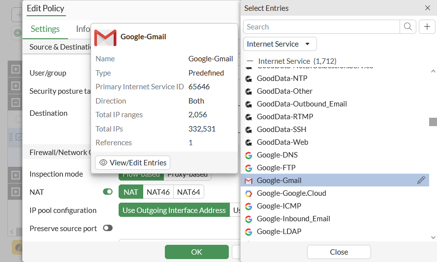 In the Select Entries pane, select Internet Service from the dropdown list and select Google-Gmail.
