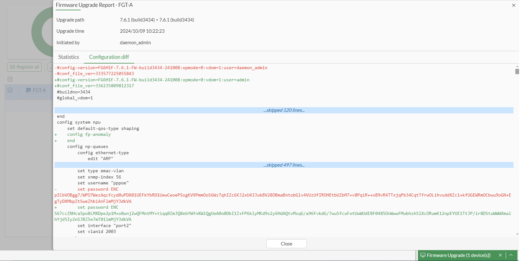 Double-click a FortiGate to display its firmware upgrade report. The firmware upgrade report contains the following tabs: Statistics and Configuration diff.