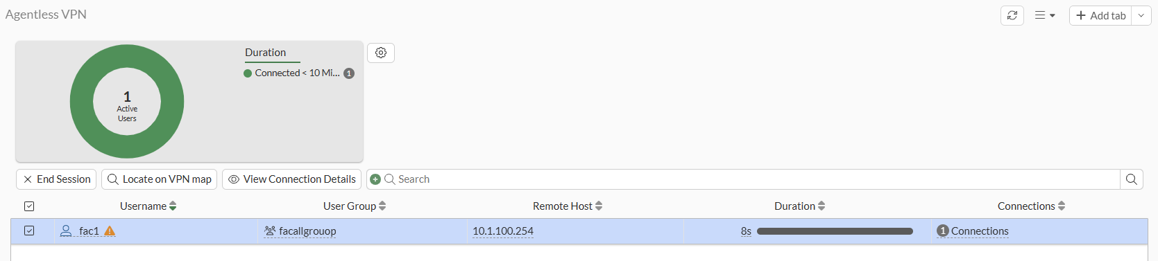 The Agentless VPN monitor displays remote user logins and active connections. You can use the monitor to disconnect a specific connection. The monitor will notify you when VPN users have not enabled two-factor authentication.