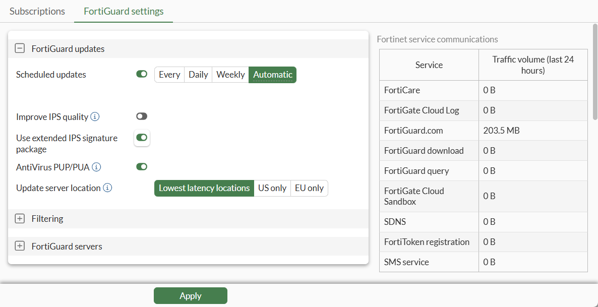 - In the FortiGuard updates section, set Update server location to Lowest latency locations, US only, or EU only.