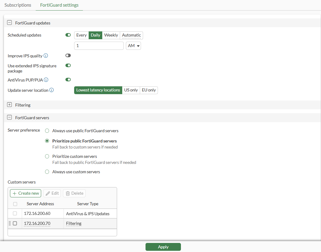 Under FortiGuard servers, set Server preference to Always use custom servers.