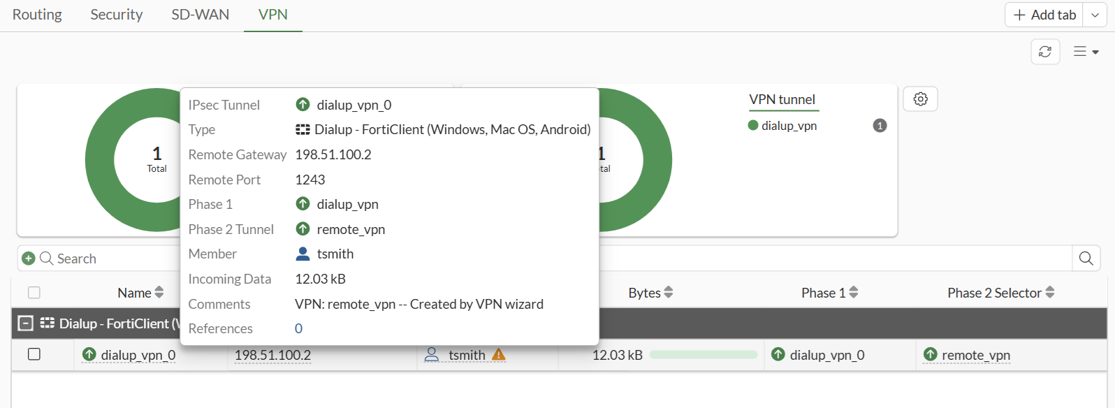 Find the new tunnel, dialup_vpn_0 in this example, and check the statuses of the Phase 1 and Phase 2 selectors.
