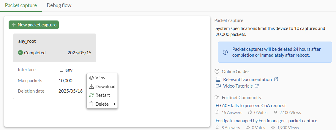 The limit of simultaneous packet captures and the number of packets per capture that can be saved is dependent on the FortiGate model and capabilities. If this limit is reached, new packet captures cannot be created. Go to Network > Diagnostics to view the limit values.