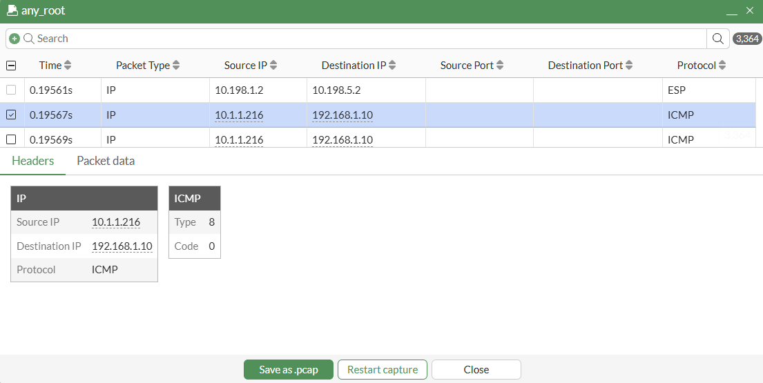 Administrators can use the packet capture tool to select a packet and view its header and payload information in real-time. Once completed, packets can be filtered by various fields or through the search bar. The capture can be saved as a PCAP file that you can use with a third-party application, such as Wireshark, for further analysis.