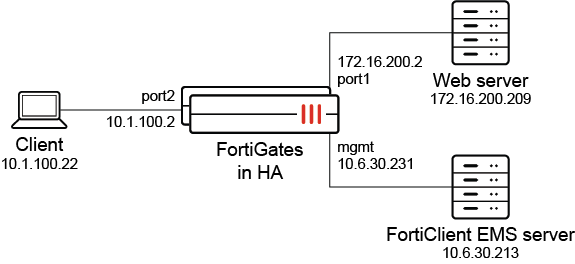 In this example, a FortiGate HA pair is acting as a ZTNA access proxy. Clients that are trying to access the web server on qa.test.com are proxied by the ZTNA access proxy. Remote clients must be registered to the EMS server, and pass a client certificate check and user authentication in order to connect. Upon HA member failure, a failover occurs and the new primary unit will continue to allow connections without requesting client certificate check and user authentication for existing users and devices.