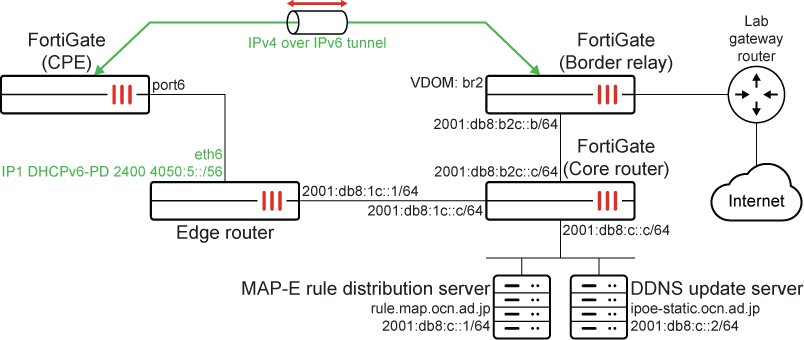 config system vne-interface edit "vne.port6" set interface "port6" next end# diagnose test application vned 1 ---------------------------------------------------------------------------- vdom: root/0, is master, devname=port6 link=1 tun=vne.port6 mode=map-e ssl_cert=Fortinet_Factory end user ipv6 perfix: 2400:4050:6::/56 interface ipv6 addr: 2400:4050:6::1 bmr rule ipv6 perfix: 2400:4050:6::/56 bmr rule ipv4 perfix: 192.0.2.34/32 bmr rule br: 2001:db8:b2c::b bmr rule hostname: Testbed6_dhcpv6-pd-IP1 saved hostname: Testbed6_dhcpv6-pd-IP1 tunnel br: 2001:db8:b2c::b tunnel ipv6 addr: 2400:4050:6:0:c0:2:2200:0 tunnel ipv4 addr: 192.0.2.34/255.255.255.255 update result: good Map-e rule client: state=succeed retries=0 interval=60 expiry=23634 reply_code=200 fqdn=rule.map.ocn.ad.jp num=1 cur=0 ttl=86400 expiry=0 2001:db8:c::1 Map-e DDNS client: state=succeed retries=0 interval=120 expiry=61372 reply_code=200 fqdn=ipoe-static.ocn.ad.jp num=1 cur=0 ttl=86400 expiry=0 2001:db8:c::2
