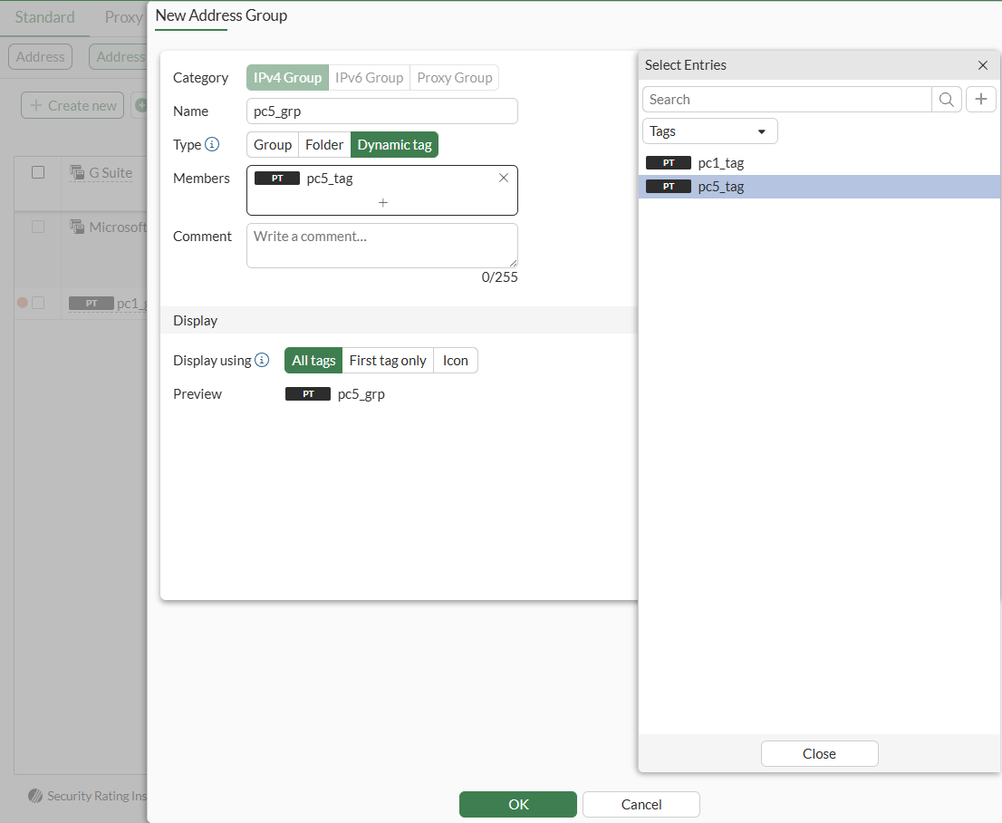 Create two dynamic tag address groups with the following tags as group members: pc1_tag and pc5_tag: