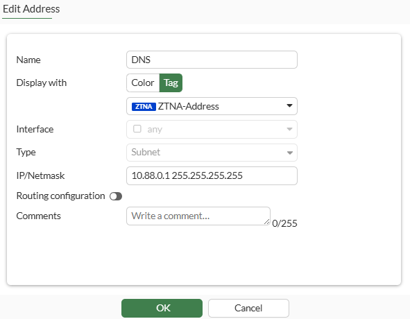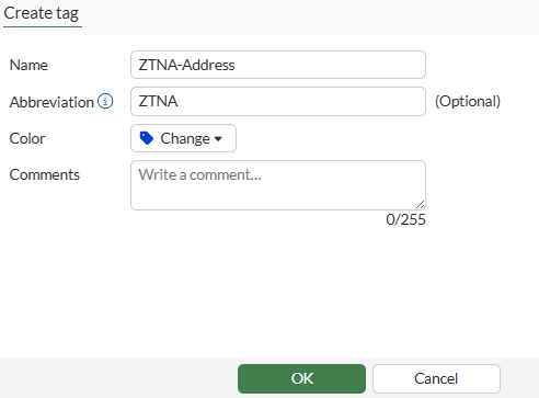 Custom tags can be created and applied to various address types, address groups, and policy types. This helps administrators organize their addresses and policies, quickly visualize the category, and easily filter based on the assigned tags when many addresses and policies are configured.
