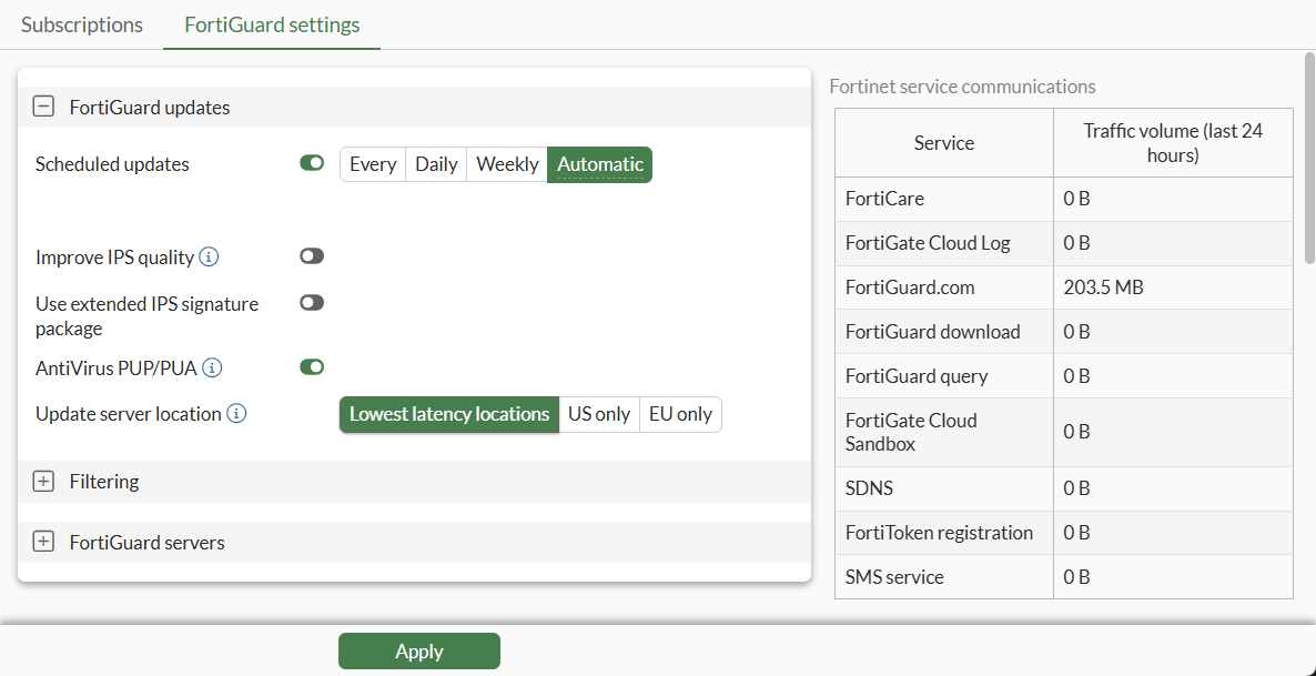 - In the FortiGuard Updates section, enable Scheduled Updates and select Automatic.