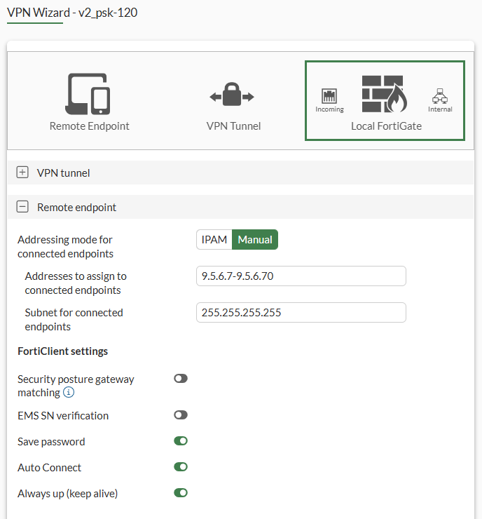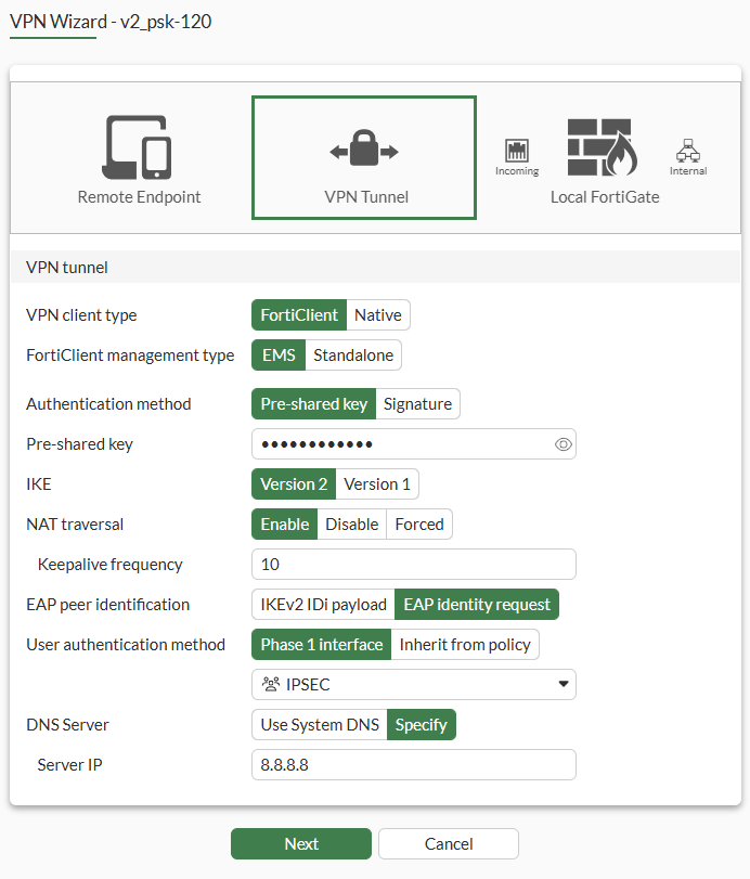 config vpn ipsec phase1-interface edit "v2_psk-120" set type dynamic set interface "port1" set ike-version 2 set peertype any set net-device disable set mode-cfg enable set ipv4-dns-server1 8.8.8.8 set proposal aes128-sha256 aes256-sha256 aes128gcm-prfsha256 aes256gcm-prfsha384 chacha20poly1305-prfsha256 set dhgrp 20 21 set eap enable set eap-identity send-request set authusrgrp "IPSEC" set ipv4-start-ip 9.5.6.7 set ipv4-end-ip 9.5.6.70 set ipv4-split-include "v2_psk-120_split" set save-password enable set client-auto-negotiate enable set client-keep-alive enable set psksecret ******* next endOne or more user groups for user authentication can be configured under a single IPsec VPN tunnel. See Using single or multiple user groups for user authentication for details.