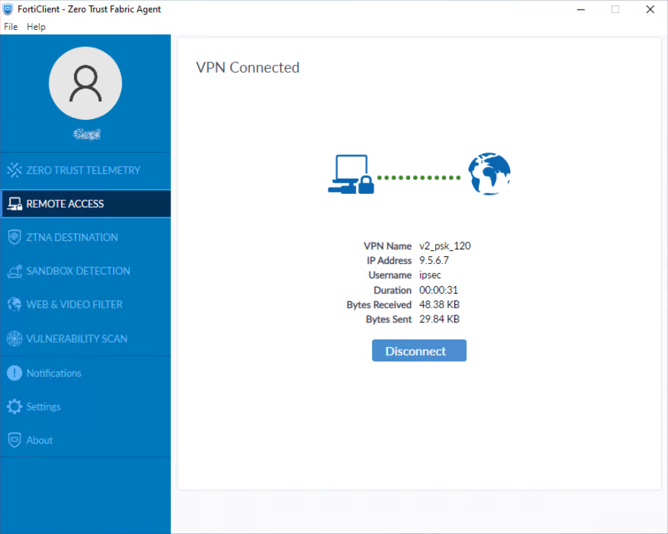 Using FortiClient, connect to the IPsec VPN gateway.