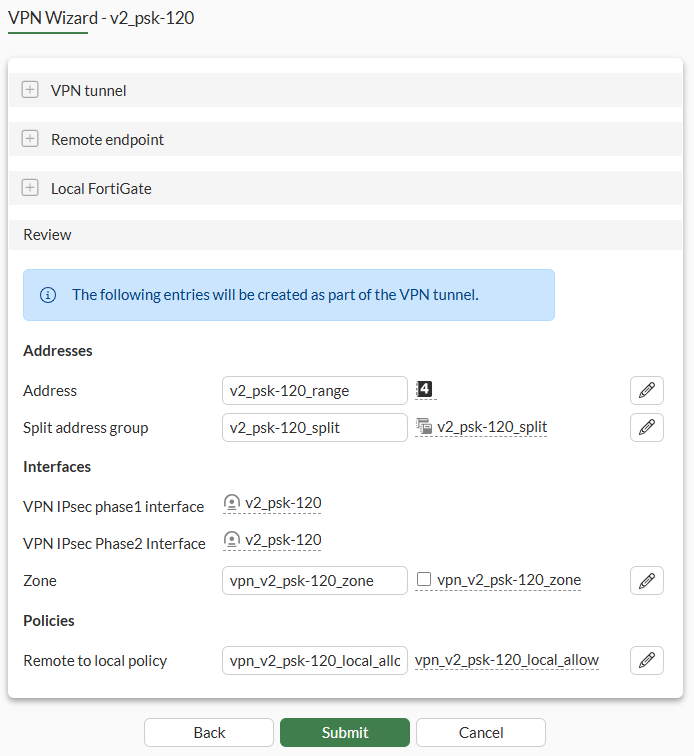 config firewall policy edit 1 set name "vpn_v2_psk-120_local_allow" set srcintf "vpn_v2_psk-120_zone" set dstintf "port3" set action accept set srcaddr "v2_psk-120_range" set dstaddr "internal network" set schedule "always" set service "ALL" set nat enable next end