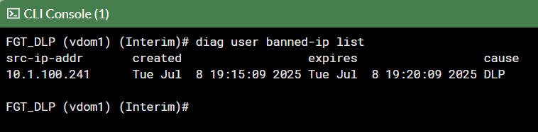 This scenario demonstrates what happens when the FortiGate DLP profile has action set to quarantine-ip: