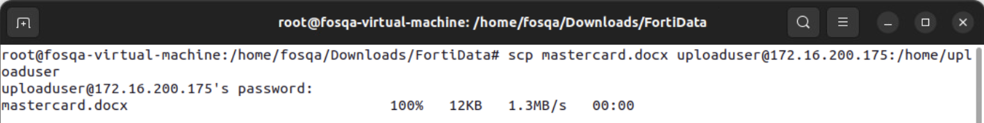 When the user attempts to post a file (mastercard.docx) that matches a FortiData label, FortiGate passes the file through.